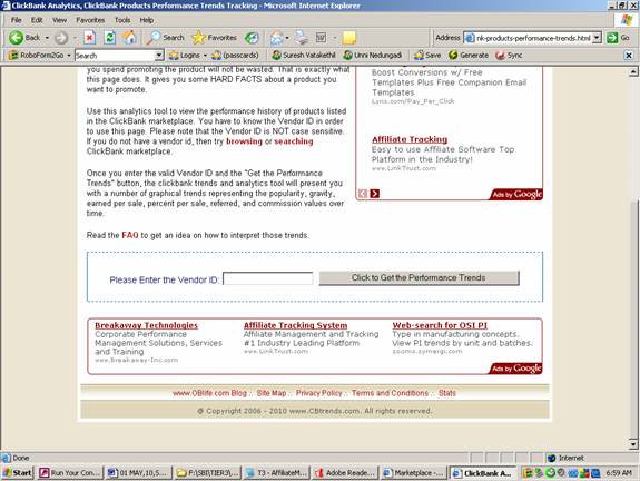 > Click here to see the rest of the stats and its explanations, from Click bank. With Click bank’s affiliate marketing directory the above strategies will help you to pin down the winners! >Top< The very first thing that you will look for, when scanning for products, in this 'Affiliate Marketing Directory', is, the commission paid. And, an affiliate marketing directory like, Click bank, has no dearth of products and ‘Affiliate Marketing Programs’. As this is a good thing, the bad part is that, you may pick a wrong product, that will end up in poor returns. To avoid that, here are some rules that I stick to, and, you should also do the same.: The Unsung Rules of Click Bank ---> Do not promote anything that pays less than 50% in commission. ---> The avg $/sale, in the sample above is $46.37. This is the amount you will be paid on each sale, less fees and refunds. As far as possible, do not promote anything that pays less than $25.00. Of course, this is just a pointer or a guide. Use your own discretion, when coming up with this number. ---> Pick the rising stars from this affiliate marketing directory. When I say rising stars, go for a gravity between 10 - 70. Now, if the product is a niche product, with a gravity close to 70, then, I generally avoid that item. Reason? It's probably nearing saturation. Now, if the 'Affiliate Program' is say from a niche like, 'Make Money Online', with a gravity of 70, then it cannot be considered as nearing saturation. Do you get my point? Once you have filtered out thus, your products from Click bank's affiliate marketing directory, you will move on to the next step of analyzing the sales letter or the landing page. 2 - Sales letter/Landing page evaluation: This is a very crucial step to your success with 'Affiliate Marketing', both as an affiliate, and as part of your 'Affiliate Marketing Program', if you are employing affiliate marketing, as part of your 'Internet Marketing Strategy'". 'Must Have' "Copywriting" training and coaching, to make tremendous difference to your landing page. >Top< OK. Let's proceed with our evaluation of the sales letter. Your evaluation should be focused on the conversion of the sales letter. You can get an idea by reading the sales page. Now, this will come from experience. As you read and evaluate sales letters, you will become better at spotting the sale letters, that convert well, with increasing accuracy. Here are a few quick tips that you can employ to assess the sales letter's conversion capability: ---> Does the design of the page/site looks clean, professional and presentable? Amateurish design, will turn off buyers. Period. ---> Is the sales copy convincing enough? A tough question. How to sort this one? OK. Firstly, see if the sales copy is full of benefits, with the excitement flowing from it. Here is an example: "I cannot believe this, that I have finally cracked the code for "Google Adwords", that enable me to bid on extremely high value keywords, by only paying pittance." This kind of a sales letter, is a winner. On the other hand, if you have a sales letter that is dull and dreary, then you should be better of not promoting that. ---> Does the sales letter have the following: -> Time sensitive offers. The sales letter has limited time pricing, and forces the buyer to act fast, by creating a sense of urgency. -> Exciting headline. If the headline really excites you, then it will probably excite others too. -> Testimonials. This is a psychological factor. Testimonials are proof of the effectiveness of a product, and instills a sense of social proofing into the buyer. Picking the right affiliate program or product from Click bank's 'Affiliate Marketing Directory', has to be your number one priority for your success. If you follow the guidelines on this page, then this could be your only affiliate marketing directory, required, to make a fulltime living. >Top< 3 - Is Your Click bank Product a Rising Star? The idea is to pick a program from Click bank 'Affiliate Marketing Directory', that is relatively new, without much affiliates promoting the same. Ride it to the top of its popularity, and quit just in time, when, large number of affiliates, flock, to promote the product. One way to do this, is to continuously, monitor the Click bank affiliate marketing directory, for the movements of the 'Affiliate Programs', up and down the ranking. But, it will be a pain, to do this manually. I want to direct you, to, one of the least used free tool called CB Trends. Now with this tool, you just enter enter a Click bank product, and it will give you all kinds of analytics on the product; basically telling you, how the product has been selling for the past couple of weeks, whether the payouts are going up/down, and how its rankings are within the respective category. Go back to Click bank marketplace. Select the product. I have chosen 'Keyword Elite 2.0', as the sample, from the 'Business and Marketing' category. Do a right click on the product name. Then click on the properties. This will come with a url like this: http://zzzzz.bryxen4.hop.clickbank.net/ Now the piece on the above URL, that we are interested in is 'bryxen4'. OK. Head back to the CB Trends Vendor page, and and enter the above merchant ID 'bryxen4'. You will see the screen as shown on the screen shot below: -> CB Trends Vendor Page Image For Keyword Elite 2.0 -> Click here to see the analytics OK. Now, how to interpret and analyze this stuff? Easy. > Popularity: If popularity is declining on the graph, it means that, the product is gaining in popularity. No.1 indicates, the product is most popular. > Gravity: A climbing graph indicates, that, more and more affiliates are promoting the product. Now, mind you, we are actually looking for a product, that is, climbing the popularity chart, meaning, the popularity chart, you will see, is coming down, inwards rapidly. This is how you are going to read it. You will find that the, gravity chart is also on the rise